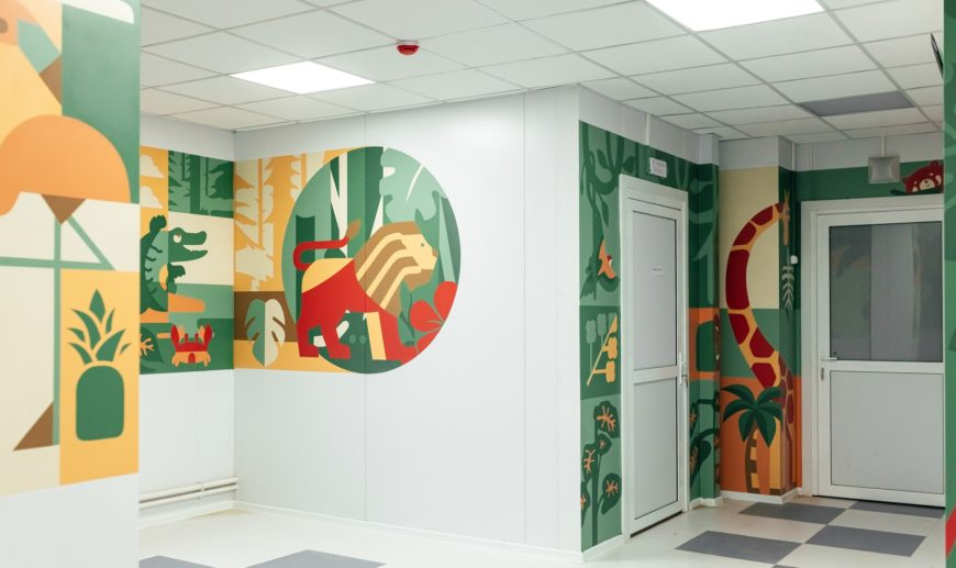 В рамках реализации национального проекта «Здравоохранение» и программы «Модернизация первичного звена здравоохранения» для создания комфортной и благоприятной среды для маленьких пациентов проводится роспись двух этажей отделения общей площадью около 200 квадратных метров. Хотим поделиться результатом работы наших художников Graffiti Russia по созданию теплой атмосферы детской больницы в городе Карталы. Всегда чувствуется ответственность при создании подобных проектов, ведь наши рисунки не только украшают помещение, но и влияют на самочувствие и настроение маленьких пациентов. Вспомните себя в детстве: ты вместе с мамой идешь по коридору и боишься той неизвестности, что скрывается за дверью доктора. Но вокруг яркие персонажи из детства, милые зверюшки, красивые узоры, и вот ты уже радостно следуешь за рисунками и не переживаешь – в таком красивом месте тебе точно помогут . К нашей команде обратились в рамках реализации национального проекта «Здравоохранение» и программы «Модернизация