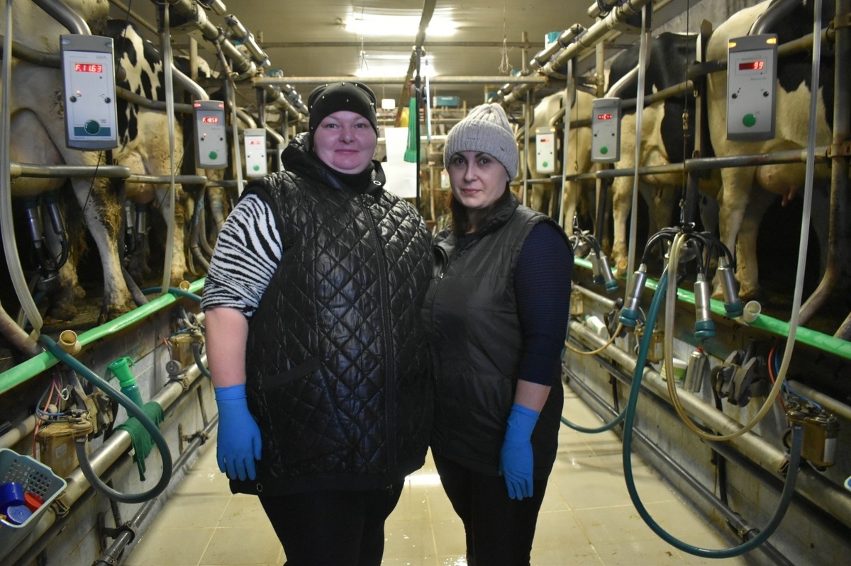 Эльнара Юсупова и Ксения Кулак работают доярками в ООО "Регионагро" Обе женщины живут в Ленинском. Эльнара Юсупова оператор машинного доения уже десять лет. « Это и не так уж тяжело. Дойка современная, не вручную, условия на ферме хорошие. Зимой помещение отапливается, летом там вентиляция, - говорит Эльнара. - Наши обязанности не просто доить. Мы смотрим, как корова себя чувствует. Если что-то не так – сообщаем ветеринару. Как доярки, мы обязательно следим за выменем. Особенно, если корова после отёла. Здесь же, на ферме, работает и мой муж. Его обязанности - смотреть за быками. У нас трое детей. Старшему сыну девятнадцать лет, он сейчас служит в армии. Второй сын учится в нашем аграрном университете на инженера – механика". Ксения Кулак на ферме пятый год. «В Ленинском я живу с рождения. У меня и родители деревенские, - рассказывает Ксения. - На ферму решила пойти потому, что очень люблю работать с животными. Встаю я в четвёртом часу утра, так как в пять уже начинается дойка. К ней