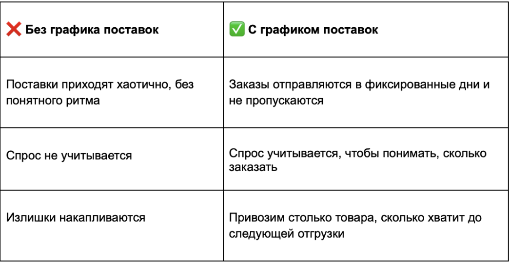 Товар есть, продажи идут — а денег всё равно не хватает. Знакомая ситуация? Часто причина в излишках: товар лежит на складе, замораживает деньги и тянет бизнес вниз. Как этого избежать и держать запасы под контролем? Анастасия Погорелова, руководитель проектов StockM, поделится пятью практическими советами, которые помогают компаниям снижать излишки, ускорять оборачиваемость и гибко реагировать на спрос. График поставок — это опора для управления запасами. Он помогает понимать, сколько товара должно быть между отгрузками, чтобы склад не пустел, но и не переполнялся остатками. Да, маркетплейсы часто ограничивают слоты и усложняют планирование. Но даже в этих условиях важно соблюдать график хотя бы со стороны продавца: понимать свой ритм поставок и отталкиваться от него при расчётах запасов. Разница между хаотичными поставками и работой по графику выглядит так: Частые поставки небольшими партиями позволяют быстрее реагировать на спрос: товар раскупили — вы быстро пополнили остатки, спрос