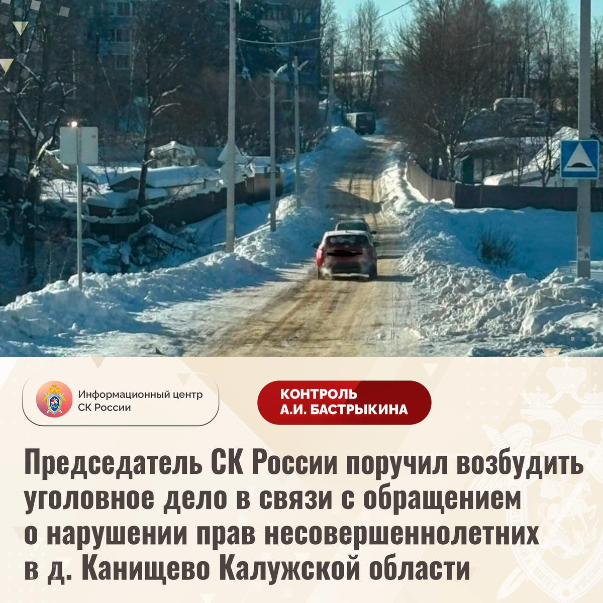 Председатель СК России поручил возбудить уголовное дело в связи с обращением о нарушении прав несовершеннолетних в д. Канищево Калужской области К Председателю СК России А.И. Бастрыкину через Информационный центр поступило обращение по вопросу нарушения прав несовершеннолетних в деревне Канищево Калужской области. Два образовательных учреждения находятся на значительном расстоянии от мест проживания учеников, однако перевозка детей на школьном автобусе не организована, движение общественного транспорта не осуществляется. При этом дорога к учебным заведениям не оборудована тротуарами и освещением, из-за чего несовершеннолетние вынуждены передвигаться по проезжей части. Обращения родителей в компетентные органы результатов не принесли, мер к разрешению проблемы не принимается. Указанная ситуация освещалась в СМИ. Председатель Следственного комитета Российской Федерации Александр Иванович Бастрыкин поручил руководителю СУ СК России по Калужской области Марку Сергеевичу Харламову возбудит