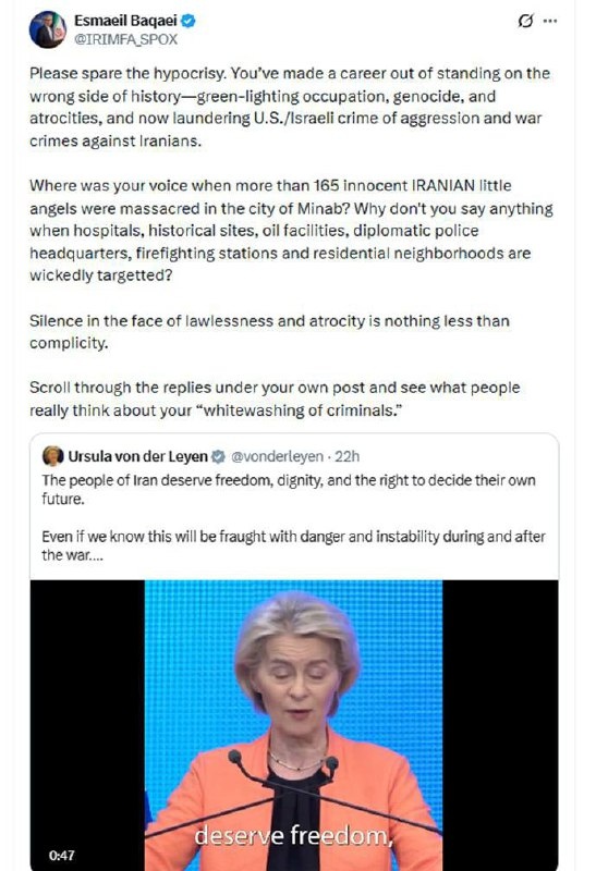 » Դուք ամբողջ կյանքն անցկացրել եք պատմության սխալ կողմում՝ կանաչ լույս տալով օկուպացիային և հաստատելով ցեղասպանությունն ու սարսափելի հանցագործությունները։ Եվ հիմա դուք փորձում եք մաքրագործել Ամերիկայի և Իսրայելի ագրեսիան և պատերազմական հանցագործությունները իրանցիների դեմ։ Երբ Մինաբ քաղաքում կոտորվեցին ավելի քան 165 իրանցի փոքրիկ հրեշտակներ, որտե՞ղ էիք դուք։ Ինչո՞ւ եք լռում, երբ հիվանդանոցները, պատմական վայրերը, նավթային օբյեկտները, դիվանագիտական շտաբները, հրշեջ կայանները և բնակելի տարածքները ագրեսորների անողոք հարձակումների թիրախ են։ Անօրինականության և հանցագործության առջև լռությունը ոչ այլ ինչ է, քան հանցակցություն։