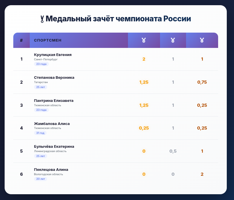 🏆 Медальный зачёт (только личные медалисты + бонусы)