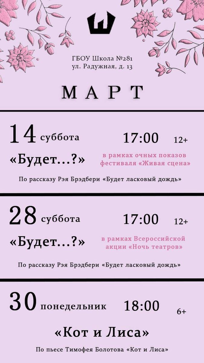 🎭 📣 Театральная студия «Шум за сценой» делится афишей на март! В репертуаре театра: 🔹 Спектакль «Будет...» по рассказу Рэя Брэдбери «Будет ласковый дождь» 🔹 Спектакль «Кот и лиса» по пьесе Тимофея Болотова ✨ Следите за обновлениями! 📣 Школа № 281 в MAX #ДОНМ #РоссияМояРодина