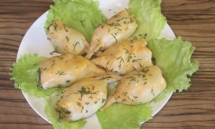 - Полить кальмаров сверху самодельным соусом бешамель.