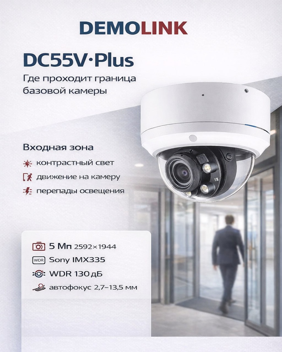 Есть сцены, где обычная базовая камера начинает работать на пределе своих возможностей. И это места, где люди почти всегда движутся прямо на камеру. Именно здесь становится заметно, где заканчиваются возможности базового класса. Сцена, где начинается проблема Типичная входная зона: 🚪 стеклянная дверь 💡 яркий свет с улицы 👤 человек движется прямо в объектив В одном кадре появляются сразу несколько сложных факторов: — контраст между улицей и помещением — движение навстречу камере — быстрые изменения освещения В такой ситуации лицо человека может теряться в кадре. Почему базовой камеры уже недостаточно Когда сцена усложняется, проявляются ограничения базового уровня: — слабая работа с контрастным светом — нестабильная экспозиция при движении — потеря деталей лица Особенно это заметно, когда человек входит с улицы в подъезд или офис. В этот момент камера должна быстро перестроить изображение, и базовый уровень делает это не всегда стабильно. Камеры уровня Plus рассчитаны именн