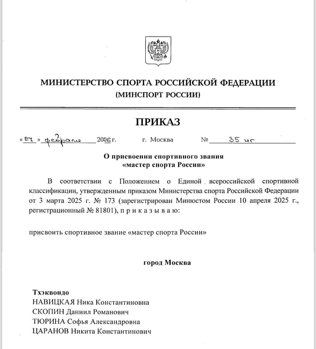 Приказом Министерства Российской Федерации от 27.02.2026 Тюриной Софье присвоено звание "Мастер спорта".