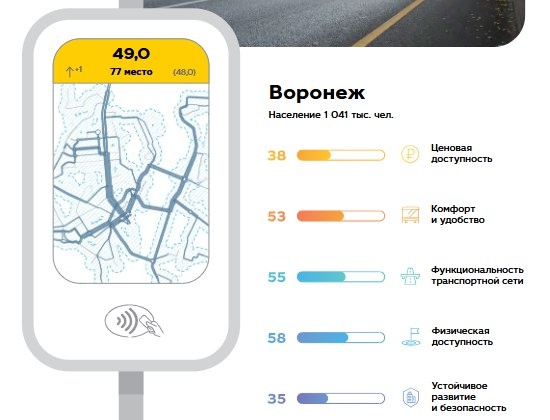 Воронеж занял 77 место из 100 в Рейтинге городов России по качеству общественного транспорта за 2026 год, составленному компанией "Симетра