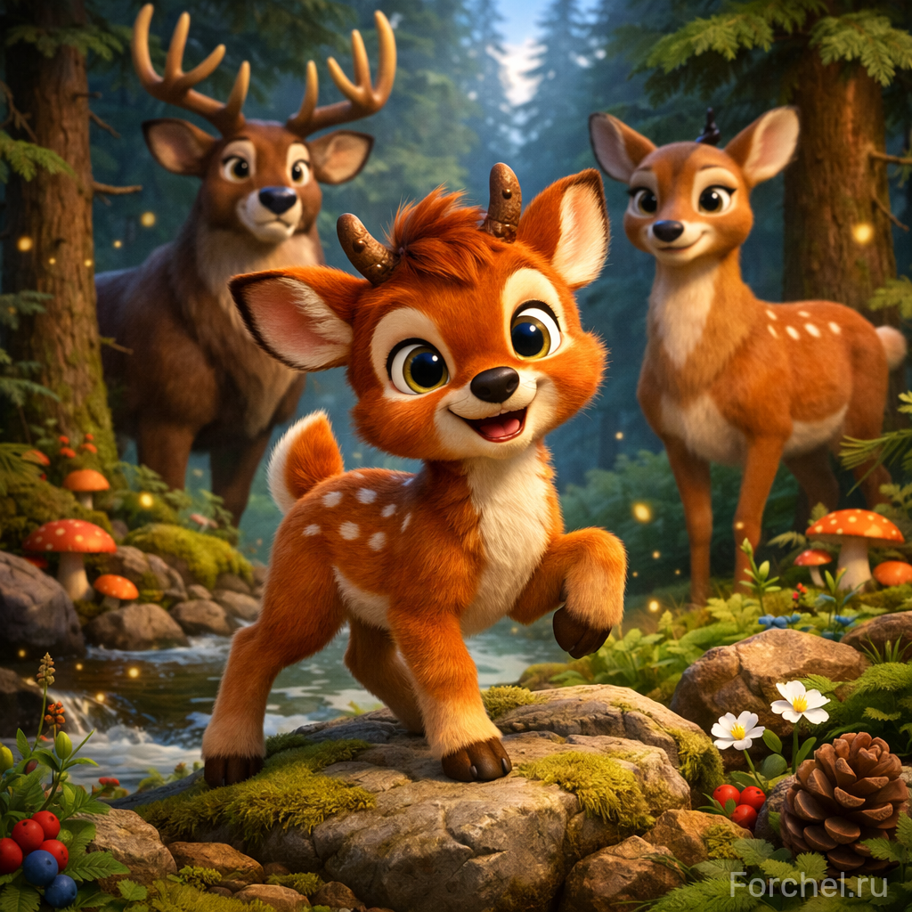 В дремучем северном лесу жил маленький озорной оленёнок по имени Рыжик. Его родители были мудрыми оленями, знали лес вдоль и поперёк и всегда давали сыну полезные советы. Но вот беда — Рыжик совсем не хотел прислушиваться к ним!