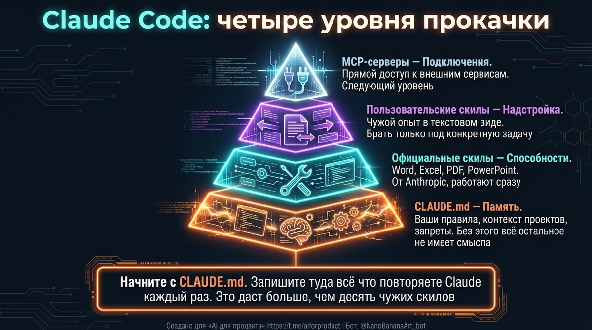 Главная причина путаницы — одним словом "скил" называют четыре принципиально разные вещи. Отсюда ощущение что нужно срочно всё подключить и не отстать. На деле — нет. В этой статье покажем что есть что, как одно отличается от другого, и с чего реально начать если вы уже работаете с Claude Code.