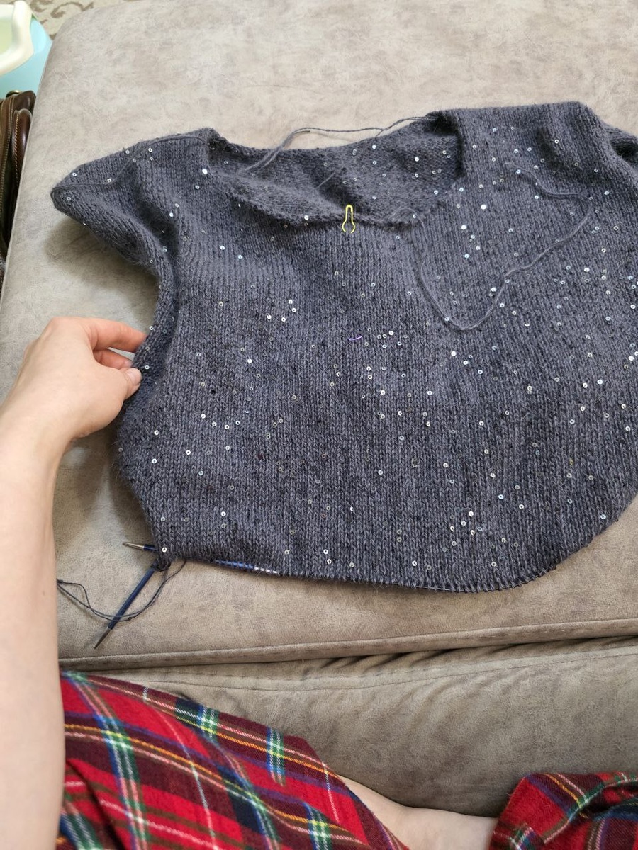 По джемперу из ангоры неплохие продвижения. Пора обработать горловину, для уточнения длины джемпера.