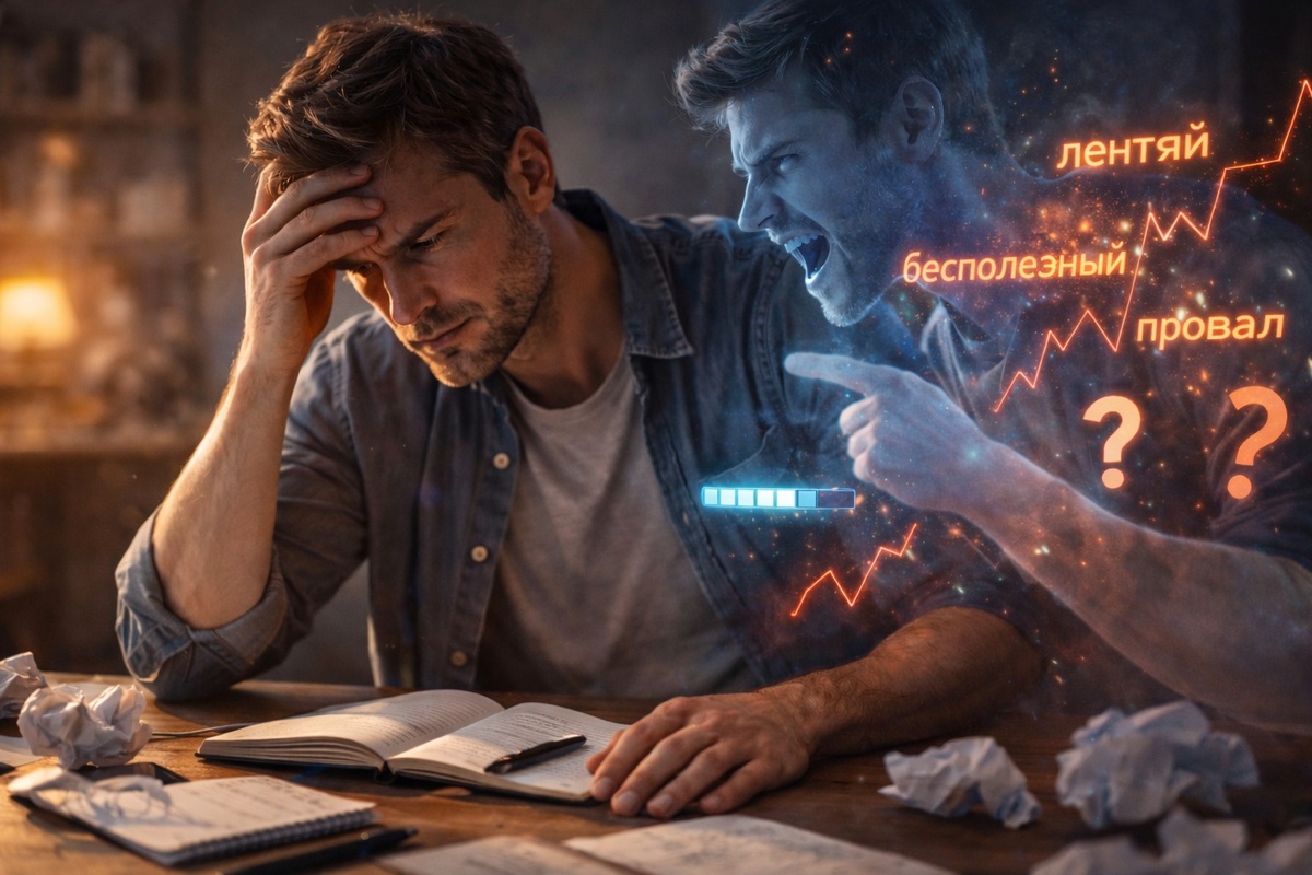 Представьте, что внутри вас поселился персонаж, который круглосуточно комментирует каждое ваше движение. В моменты триумфа он подозрительно молчит, но стоит вам ошибиться в отчёте или случайно задеть фикус в офисе, как этот комментатор переходит на крик. Мы привыкли называть это совестью или самокритикой, но зачастую это просто неэффективный шум, который мешает двигаться вперёд. Этот шум — не просто мысли, это реальный барьер для продуктивности. Когда внутренний диалог состоит из обвинений, мозг переходит в режим защиты, а не созидания. Вместо того чтобы исправлять ситуацию, вы тратите энергию на то, чтобы пережить сеанс внутренней экзекуции. Когда вы говорите себе «опять я всё завалил», вы не решаете проблему, а наклеиваете на себя ярлык. С точки зрения прагматики, это тупиковый путь. Ярлык — вещь статичная. Если я «неудачник», то и делать ничего не нужно. Это снимает ответственность, но парализует рост. Статистика личных наблюдений показывает: люди, использующие язык фактов вместо оц