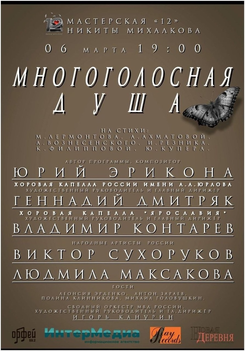 Москва ✨️В стенах «Мастерской „12“ Никиты Михалкова» произошло настоящее таинство звука и слова — премьера весенней программы Юрия Эрикона. Это был вечер, когда музыка перестала быть просто фоном и стала прямым разговором от сердца к сердцу. ✨️Гармония голосов: два мощнейших коллектива — Хоровая капелла России имени А. А. Юрлова и Филармоническая хоровая капелла «ЯРОСЛАВИЯ» — наполнили пространство невероятным звучанием а-капелла. Поэзия в музыке: Знакомые строки Лермонтова, Ахматовой, Вознесенского и Резника обрели новую жизнь в романсах и хоровых произведениях. Звездный состав: Проникновенное чтение и участие народных артистов Виктора Сухорукова и Людмилы Максаковой добавили вечеру особой глубины и драматизма. ✨Атмосфера чистого вдохновения Программа, созданная заслуженным деятелем искусств России Юрием Эриконой, объединила в себе величие классики и свежесть современных премьер. В зале царило редкое чувство единения, которое бывает только тогда, когда на сцене встречаю Показать полно