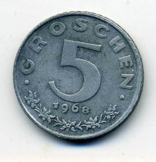 Продаю монета Австрия 5 грошей 1968 год. цинк. диаметр 18 мм. Стоимость 20 рублей.