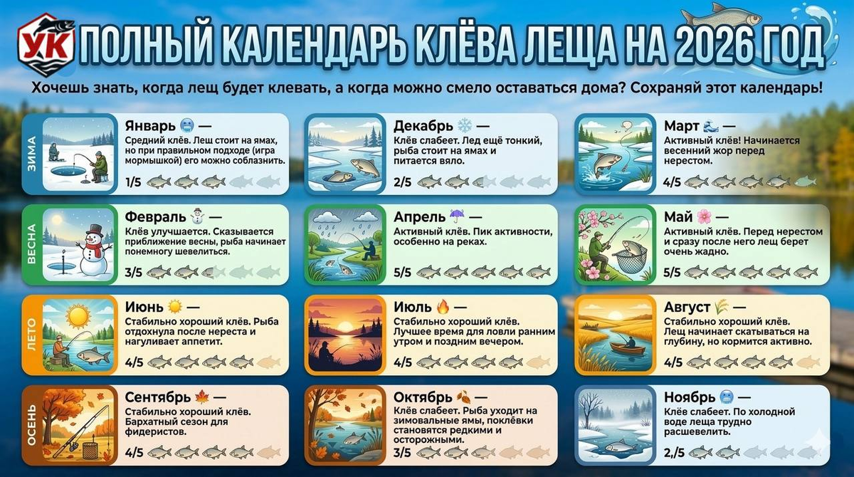 Весна вступает в свои права, а это значит, что у рыболовов начинается самое интересное время! Лёд тает, вода наполняется кислородом, и рыба просыпается от зимнего оцепенения. Лещ — одна из первых рыб, которая активизируется с приходом тепла. Где же его искать в марте? На каких глубинах он сейчас прячется? Какая насадка сведёт его с ума? А главное — когда ловить леща в течение всего года, чтобы всегда возвращаться с уловом? В этой статье ты найдёшь ответы на все вопросы! Зимой лещ — домосед. Он стоит на ямах (от 6 до 15, а то и 20 метров), экономя энергию. Но с приходом марта его поведение кардинально меняется. В марте лещу нужен калорийный и питательный корм, чтобы восстановить силы после зимы. Его вкусы в это время довольно консервативны. Вот топ самых убойных наживок: Совет: Попробуй "бутерброд" — опарыш + мотыль или червь + опарыш. Такое сочетание часто провоцирует на поклёвку самую крупную рыбу! В марте световой день увеличивается, и режим питания леща меняется. Хочешь знать, когд