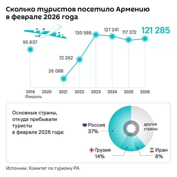 Как и в прежние годы, больше всего туристов в Армению прибыло из России. В январе–феврале 2026 года Армению посетили 300 694 туриста, сообщает Комитет по туризму республики. За аналогичный период 2025 года число посетителей составило 256 654. Из общего числа визитов в январе было зарегистрировано 179 409, в феврале — 121 285. Как и в предыдущие годы, наибольшее число туристов прибыло из России (37%). Далее следуют Грузия (14%) и Иран (8%). Доля туристов из Китая и Украины составила по 2%, из США — 1,3%, из Германии и Индии — по 1,2%, из Франции — 1,1%, из Италии — 1%. На остальные страны приходится 31,2%. Отметим, что военные действия в Иране начались в конце февраля, поэтому возможное снижение потока туристов из этой страны может проявиться уже в мартовской статистике.