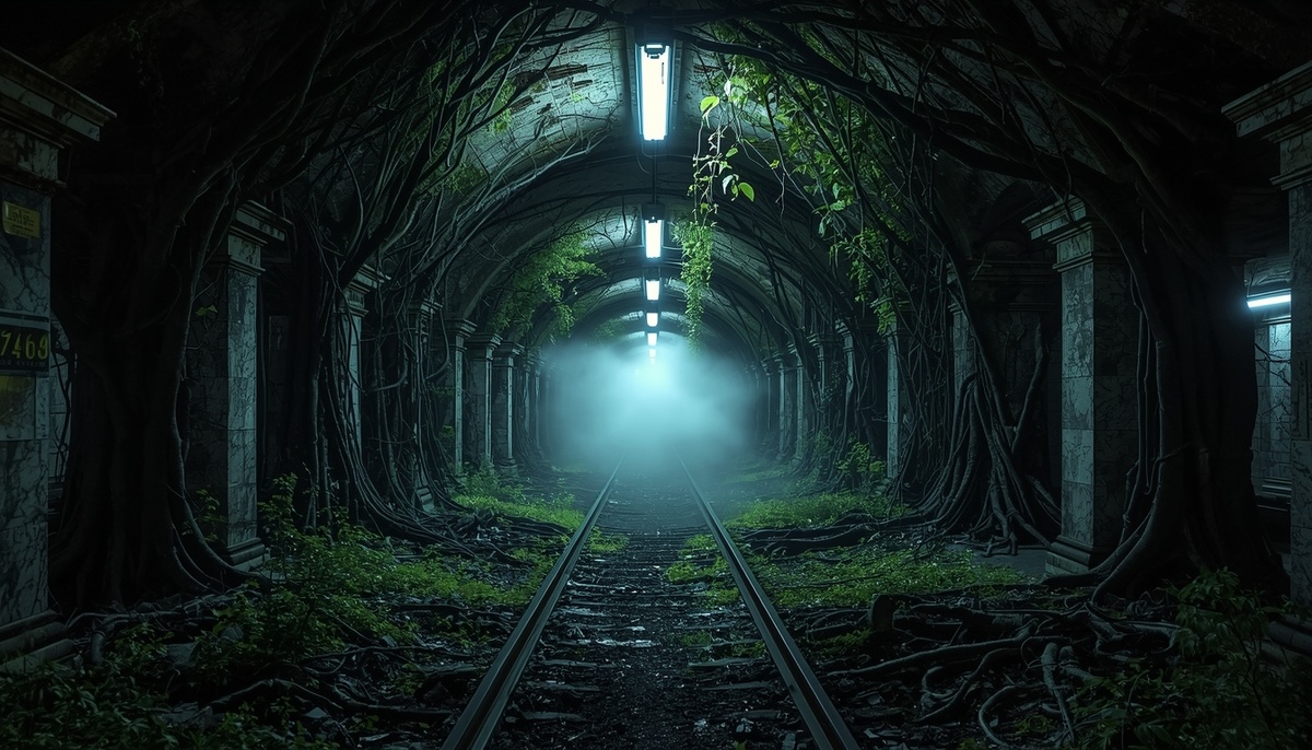 Люминесцентные лампы под потолком вагона надсадно гудели, мигали и медленно, по одной, гасли, погружая вагон в густой, удушливый сумрак. В этой наступающей темноте Александра с ледяным ужасом увидела, как по гладким пластиковым панелям стен, прямо прорывая рекламные постеры, начинают извиваться и прорастать живые, узловатые корни. Тонкие, как вздувшиеся вены, они хищно цеплялись за блестящие хромированные поручни, оплетали сиденья, с треском пробивали обшивку потолка, роняя на пол комья черной, влажной земли.