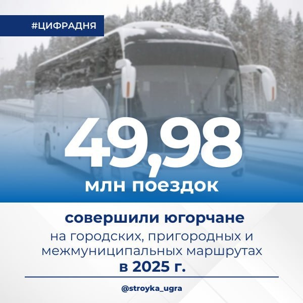 🚌 49,98 млн поездок совершили югорчане на городских, пригородных и межмуниципальных автобусных маршрутах в 2025 году. Это на 7,6% больше, чем годом ранее. Для этого перевозчики выполнили 1 млн 951 тыс. рейсов (+5,9% к 2024-му). В статистике учтены все поездки пассажиров — один человек в течение дня мог несколько раз воспользоваться автобусами, и каждая такая поездка зафиксирована. Анализ провели специалисты департамента дорожного хозяйства и транспорта ХМАО-Югры, взяв за основу сводные данные от перевозчиков. 📈 Почему общественный транспорт выбирают чаще? ➡️ В прошлом году появились новые удобные направления — в том числе в Сургутском районе, и в целом спрос на поездки среди югорчан заметно вырос. ➡️ Важную роль в том, что общественный транспорт выбирают чаще, играет поддержка округа. Благодаря бюджету удалось: ➡️ Не допустить значительного роста цен на билеты. Округ компенсирует в среднем 85,5% стоимости проезда на пригородных и межмуниципальных рейсах. Это делает поездки доступным