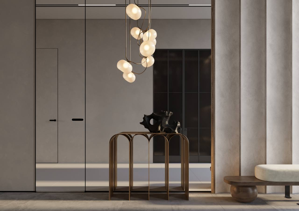Пространство встречает не яркими акцентами, а продуманной пластикой форм и света. Высокие потолки подчёркнуты подвесной композицией светильников. Центром композиции становится консоль с мягкой арочной геометрией. Тёплый оттенок металла добавляет интерьеру тактильности и баланса и гармонирует со спокойной отделкой. Панель с мягкими вертикальными складками зонирует пространство, аккуратно отделяя зону прихожей. Эстетика не мешает функциональности: системы хранения аккуратно спрятаны и не создают визуального шума, оставаясь удобными в использовании. Такая прихожая сразу задаёт настроение всего интерьера: лаконичность, обилие света, архитектурная выразительность и внимание к пропорциям. Больше о нас и наших проектах: https://arhidom-buro.ru/