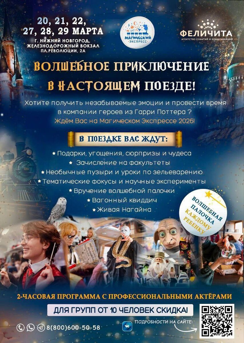 ❗️ ДЛЯ ВСЕХ ПОКЛОННИКОВ ХОГВАРТСКОЙ МАГИИ💫 и ВОЛШЕБСТВА🔮🪄 В Нижнем Новгороде запускается МАГИЧЕСКИЙ ЭКСПРЕСС 🚂 Это путешествие-приключение на настоящем движущемся поезде с полным погружением в тематику Гарри Поттера. В нашем поезде волшебную палочку дарят каждому пассажиру!🪄 На протяжении поездки гостей ждет: Распределение по факультетам Знакомство с Волшебниками, магами и их учениками Изучение первых заклинаний Магия от Волшебников Научные эксперименты Игра в Квиддич Непредсказуемые по вкусу сладости Гадания и предсказания от Сиввелы Зельеварение Фокусы 14 профессиональных актеров, создающих уникальное шоу *Всех пассажиров ждут подарки, а также сюрпризы и угощение Даты: С 20-22, 27-29 марта и 20-30 мая 🚂 Маршрут: Нижний Новгород – Семенов – Нижний Новгород ⏳ Продолжительность поездки: примерно 2 часа Встречаемся за 40 минут до отправления! Время встречи: 11:40 Время отправления: 12:15 *КОЛИЧЕСТВО МЕСТ ОГРАНИЧЕНО ‼️ДЛЯ ГРУПП ОТ 20 ЧЕЛ. ДЕЙСТВУЮТ СКИДКИ + 1 сопровождающий бе