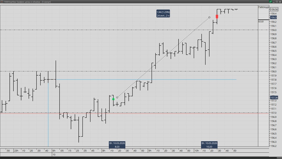 ▫️ ГМК +1,2% 📈 Точка входа ( СЛП ) 💰 Риск | Прибыль ( 1к 5 ) Красная линия на графике показывает где поставил стоп ! 🥳 Поздравляю всех, кто заработал !!! 💬 Бесплатный | Чат - ПЕРЕЙТИ #сделки