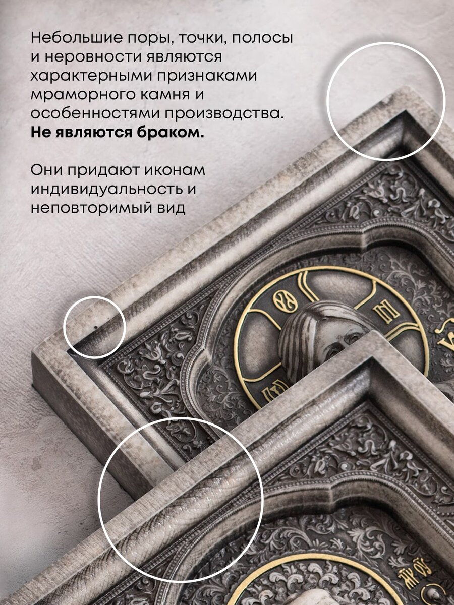 Мраморные иконы производятся из натурального или композитного мрамора. Этот материал ценится за свою красоту, прочность и долговечность. Однако, как и любой природный материал, мрамор обладает индивидуальными чертами, которые могут отличаться от привычных представлений о «идеальном» изделии. Нормальные характеристики мраморных икон