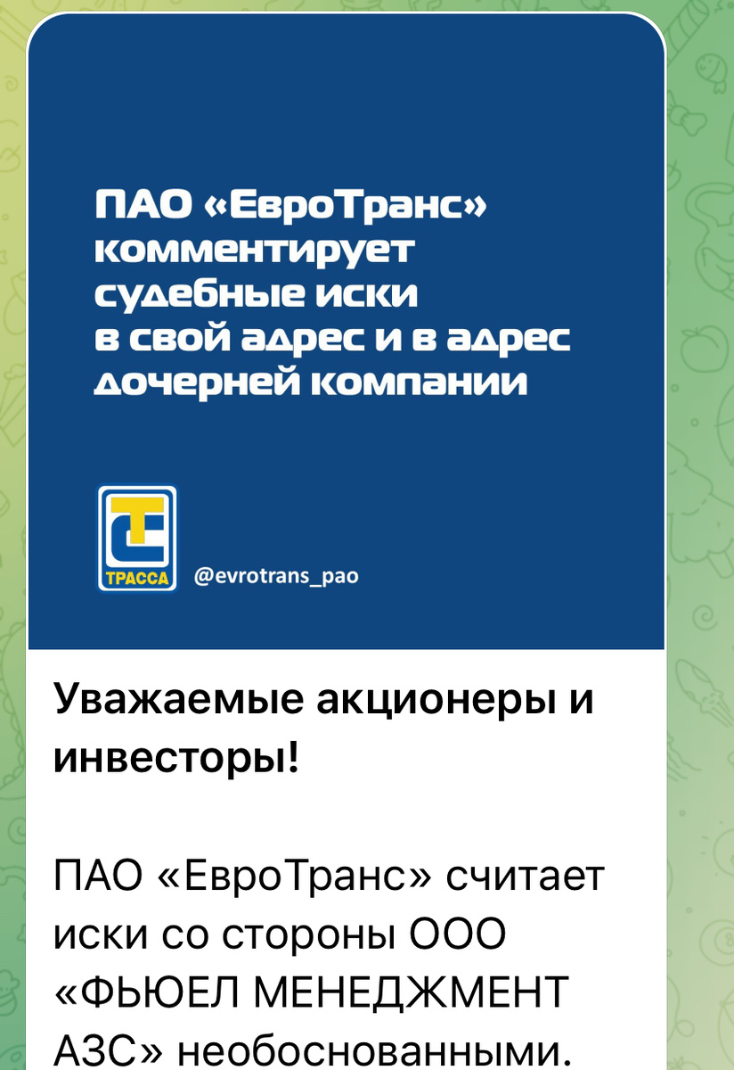 Евротранс считает поданные против него иски необоснованными — опубликовано в комментарии компании: