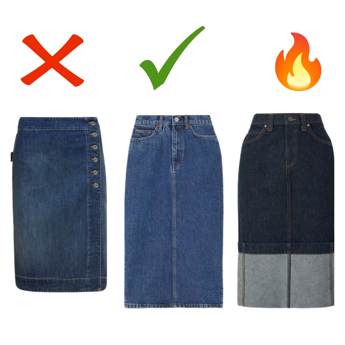 ❌Устарело: Старомодная юбка в 2026 году узкая и короткая, чуть выше колена. Такая модель зрительно укорачивает ноги, визуально увеличивая бедра и создавая диспропорцию фигуры.