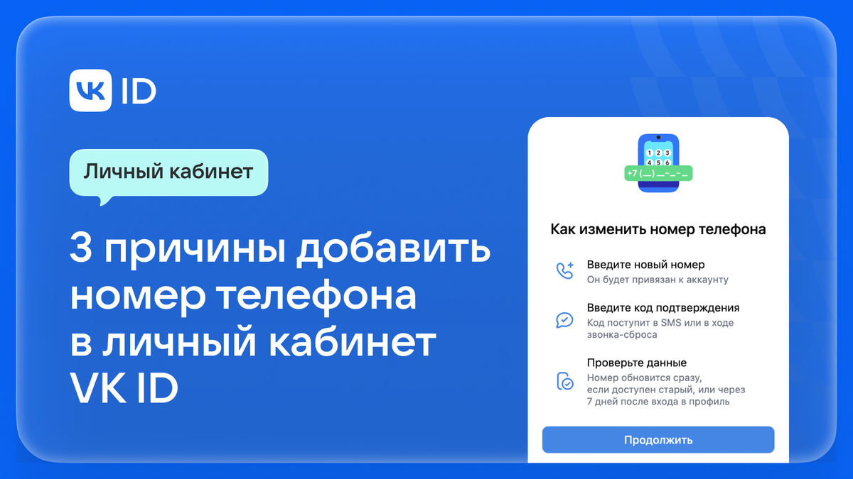 Не теряйте доступ к своему VK ID! Номер телефона в вашем личном кабинете — это главный ключ к аккаунту. Чтобы не было сюрпризов, он всегда должен быть актуальным. Надёжная защита аккаунта Актуальные данные повышают безопасность аккаунта. Если вдруг возникнет проблема с доступом, наличие верного номера поможет оперативно восстановить аккаунт Двухфакторная аутентификация Привязанный номер открывает доступ к дополнительной защите: включите 2FA. Для входа вам будет приходить код подтверждения в СМС. Удобный вход Вы сможете настроить современный способ входа без пароля — по отпечатку пальца или распознаванию лица. Загляните в раздел «Мои данные» и обновите номер, если нужно.