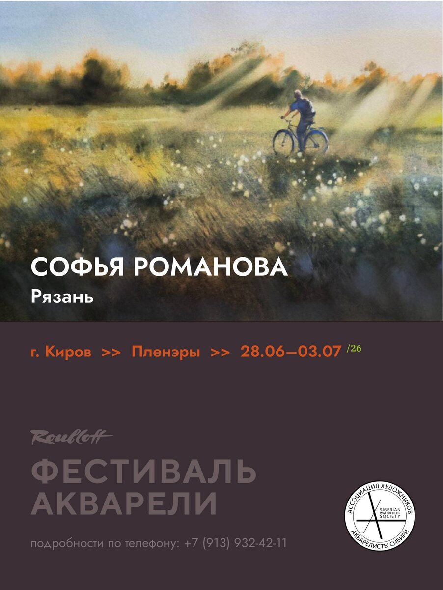 станет вашим проводником в мир лиричных городских зарисовок и романтических пейзажей на пленэрах в Кирове!🎨 Софья Романова призёр и лауреат отечественных и международных выставок и конкурсов акварели. Член Союза художников России (ВТОО Союз художников России) Член Творческого союза художников России (ТСХР) Член Ассоциации художников АКВАРЕЛИСТЫ СИБИРИ. С 2019 года преподаёт изобразительное искусство. В настоящее время преподает в детской художественной школе и творческой студии г. Рязань. Пленэры в рамках фестиваля Roubloff пройдут 28 июня - 3 июля 2026 года. Вы можете провести все эти дни только в компании с Софьей, или порисовать всего один день, принять участие в полной программе фестиваля или присоединиться в любой момент! Выбирайте любой удобный формат. В любом случае, вас ждёт интересная насыщенная программа, подарки от организаторов и спонсоров проекта, общение с единомышленниками и наставниками!🖌️ Подробности на сайте: sibartclub.tilda.ws/roubloff2026 и по телефону: 891393