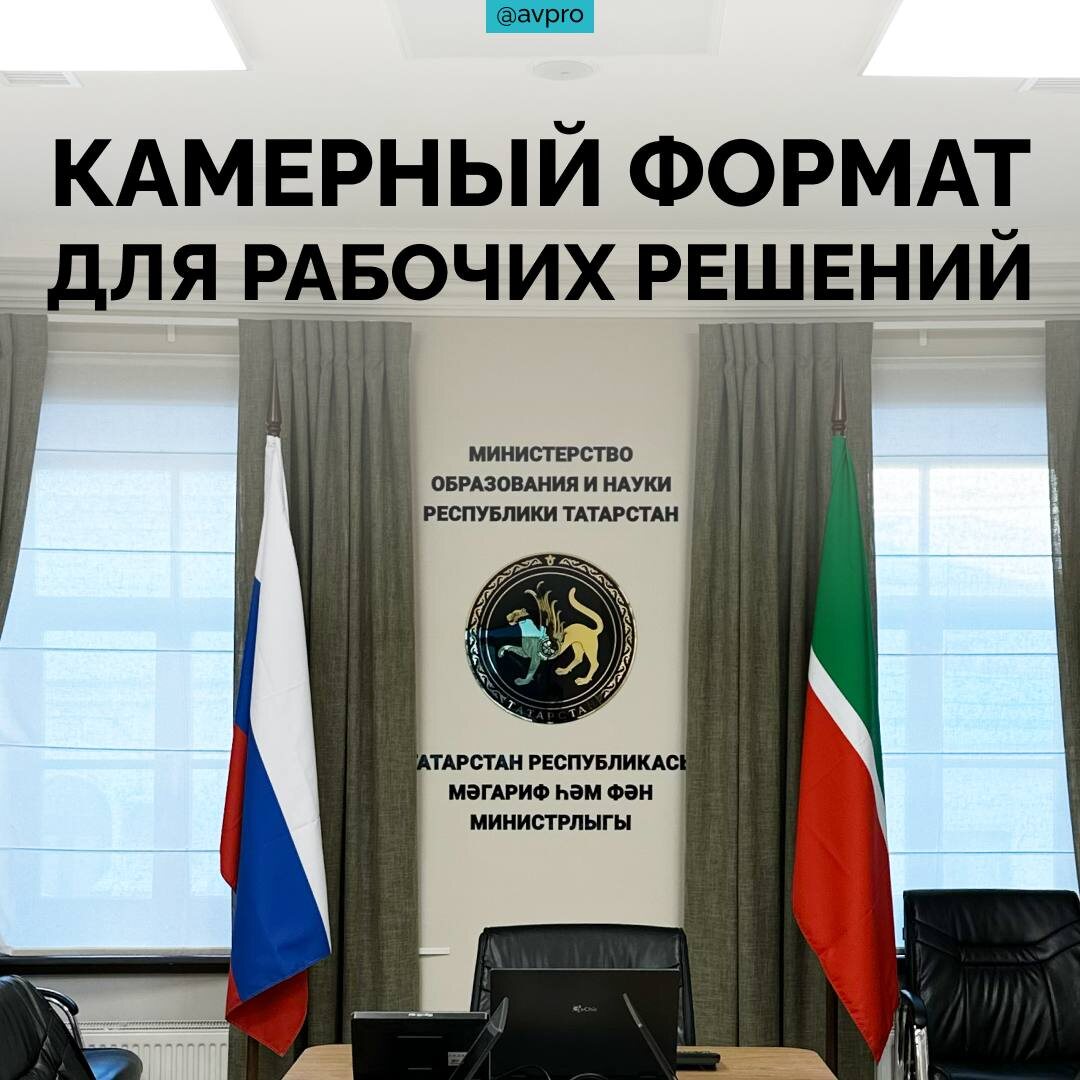 Не все решения принимаются в большом зале. Иногда важнее не масштаб, а концентрация💯. Мы уже показывали, как устроен большой конференц-зал Министерства образования Республики Татарстан. Сегодня — продолжение. Малый зал переговоров — камерный формат для рабочих встреч, обсуждений и диалога без лишнего шума. Поэтому логика пространства другая: 🔸экран и камера — для нормальной видеосвязи, а не «чтобы было»; 🔸персональные мониторы у участников — чтобы каждый работал со своей информацией; 🔸потолочный микрофонный массив — без ручных микрофонов и передачи «по кругу»; 🔸система автонаведения камеры — человек говорит, камера сама его находит; 🔸управление — под рукой, без сложных меню и технических квестов. Этот зал не пытается впечатлить. Он просто удобен. Зашёл — включил. Начали обсуждение — техника не вмешивается. Нужно подключиться удалённо — всё работает так, как ожидаешь. И в этом, пожалуй, главное. Хороший малый зал — это не уменьшенная версия большого. Это самостоятельный инст