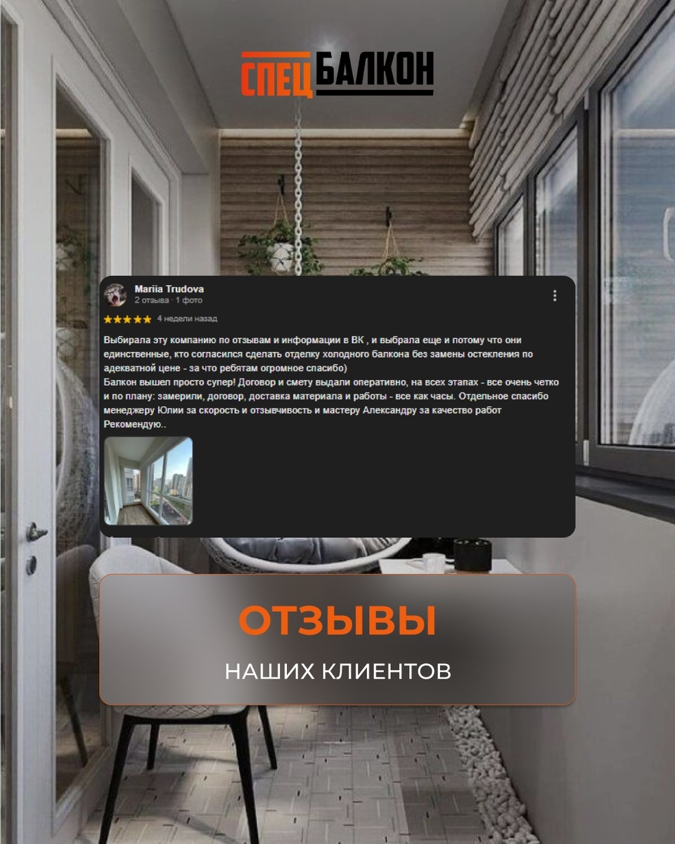 «Ребята — единственные, кто согласился сделать отделку без замены остекления по адекватной цене. Всё — как часы! Менеджер Юлия — отзывчивая и быстрая, мастер Александр — отдельное спасибо за качество работ».