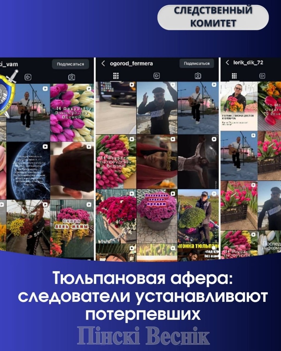По данным следствия, двое жителей Пинска разместили в соцсетях рекламу о реализации крупных партий луковиц тюльпанов. Войдя в доверие, они получили от заказчиков предоплату, но обязательства не исполнили и деньги не вернули. В результате мошеннических действий 29 потерпевших из разных регионов страны лишились не менее 230 тысяч рублей. В отношении фигурантов возбуждено уголовное дело о мошенничество в особо крупном размере. ✔️Следователи полагают, что круг потерпевших может быть больше. Если вы пострадали от действий Диковицкого Владимира Степановича, Бельчуга Юрия Михайловича, ООО «Цветовски» или КФХ «Огород фермера», сообщите по телефонам: 8 (0162) 27 37 00 или 8 (0162) 27 38 66 @Пинский Вестник 📱Ютуб 📱ВК 📱ИНСТАГРАМ 📱ОК 📱ФЕЙСБУК 📱ТИК ТОК Прислать новость