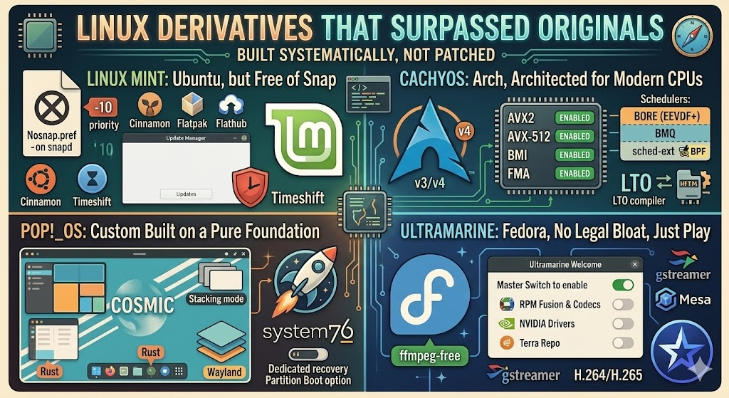 Привет, адепты чистого кода и любители копаться в железках! Сегодня у нас вечер разоблачений. Знаете, чем Linux похож на старую советскую квартиру? Фундамент крепкий, стены стоят веками, но обои клеил кто-то очень странный, а из крана вместо воды иногда течет политика корпораций. Обычно нам говорят: «Хочешь стабильности — ставь Ubuntu или Fedora». Но давайте честно: современные «оригиналы» иногда ведут себя как капризные бывшие. То они навязывают пакеты, которые вы не просили, то прячут нужные кодеки, прикрываясь юридической чистотой. К счастью, есть инженеры-альтруисты, которые берут этот фундамент и превращают его в пятизвездочный отель. Разбираем четверку героев, которые сделали работу над ошибками за своих «родителей». Ubuntu — это классика, но в последнее время компания Canonical ведет себя как навязчивый консультант в магазине электроники. Вы хотите установить браузер через обычный терминал (apt), а система такая: «Ой, я тут втихаря подсуну тебе Snap-пакет, установлю свой магазин
