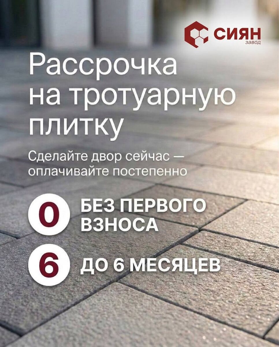 — его можно начать уже сейчас! На заводе СИЯН можно оформить рассрочку на тротуарную плитку. Как это работает: — вы выбираете плитку; — оформляете заказ; — оплачиваете его постепенно. Пока одни откладывают благоустройство, другие уже делают двор, которым будут пользоваться этим летом. Подробнее об условиях: 👉 https://siyan.ru/rassrochka/ Напишите слово ДВОР в комментариях к этому посту — отправим варианты плитки и поможем рассчитать ваш проект.