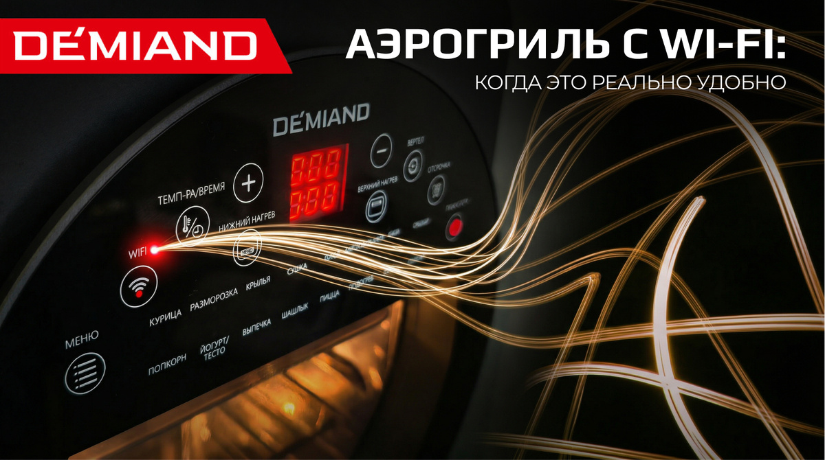 Давайте честно: когда вы впервые слышите «аэрогриль с Wi-Fi», первая мысль — «зачем?». Нажать на кнопку на корпусе — это же дело трёх секунд, разве не так? Но потом вы попробуете и по-другому уже не захочется. Вы загрузили продукты и ушли заниматься своими делами Вероятно, у вас уже есть привычный сценарий: готовить картофель в сковороде, на разогретом масле, бесконечно переворачивая и следя, чтобы ничего не подгорело. А еще успеть вовремя выключить... Очень много суеты! Но такому сценарию есть альтернатива. Курица и картофель в аэрогриле Demiand Duos (Демианд Дуос), вы — в другой комнате. Или вообще вышли за хлебом. Со смартфона вы видите таймер, температуру, можете остановить или продлить время готовки. Не нужно стоять рядом и следить за процессом. Аэрогриль перейдет в режим тепла, чтобы к вашему приходу блюдо было готово к подаче сразу же! Вы не знаете, что приготовить В приложении Demiand есть настоящая экосистема «умного дома» и книга готовых рецептов с автоматическими настройка
