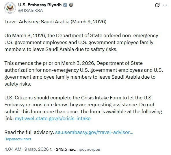 Продолжаем следить за развитием событий вокруг выезда из стран региона. Напомним, вчера Qatar Airways возобновила прямые рейсы в Москву. 🇺🇸 Новое: Госдеп США присвоил всему Ближнему Востоку высокие уровни угрозы (с 3-го по 4-й), прямо рекомендуя пересмотреть поездки в ОАЭ, Катар и Саудовскую Аравию. ⚠️ Это совпало с вывозом неэкстренного персонала американского посольства из Саудовской Аравии. ✈️ Сегодня, 10 марта, в продаже появился билет на единственный прямой рейс Qatar Airways из Дохи в Москву. 🇶🇦 Это актуальный шанс для тех, кто всё ещё находится в Катаре. #Катар #БлижнийВосток #безопасностьпутешествий @takeyourbackpack
