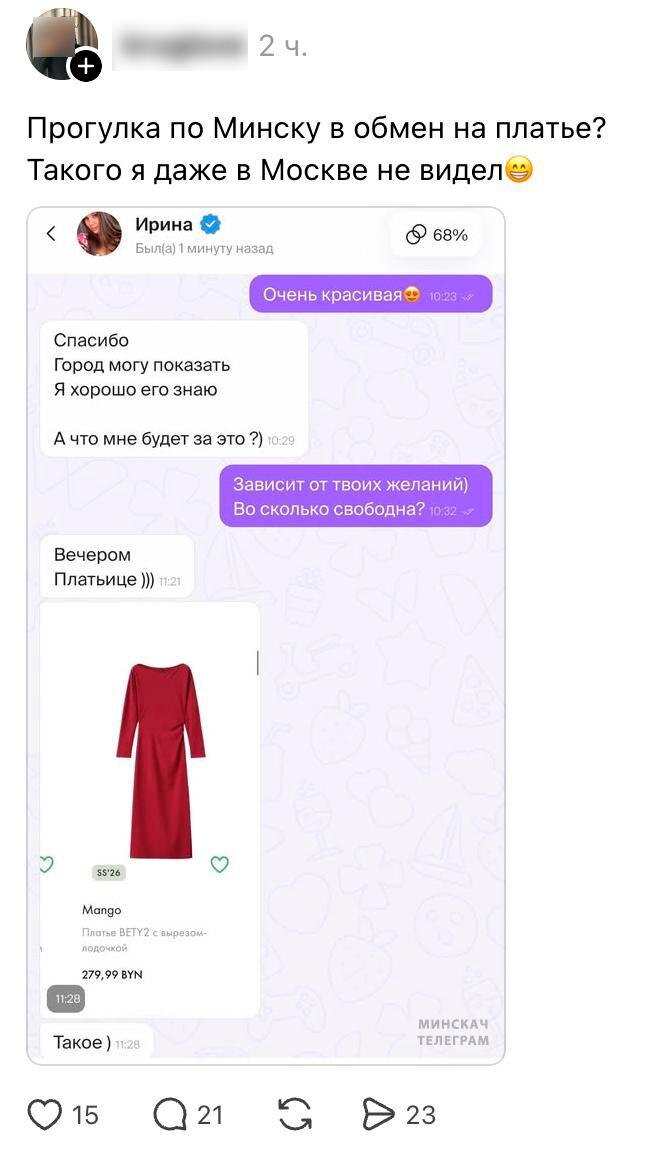😅 В приложении для знакомств девушка предложила прогулку по Минску… в обмен на платье за 279,99 рубля.