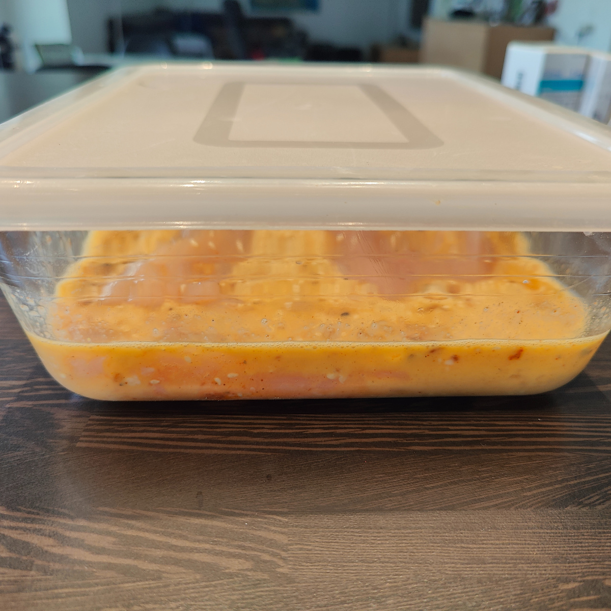Приготовить заливку: 4 яйца, 1 ст л сухой горчицы (можно взять готовую), 2 ст л крахмал, кунжут, паприка. Перемешать вилкой чтобы крахмал растворился, выложить туда отбитые грудки и убрать в хол-к.