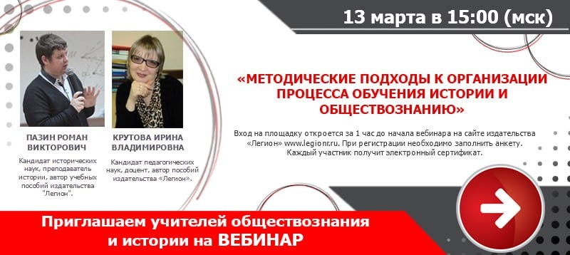 » Дата: 13.03.2026 г. Время: 15:00 Лекторы: Крутова Ирина Владимировна - кандидат педагогических наук, доцент, автор пособий издательства «Легион». Пазин Роман Викторович - кандидат исторических наук, преподаватель истории лицея НИУ ВШЭ, автор учебно-методических пособий по подготовке к ЕГЭ и ОГЭ по истории и обществознанию издательства "Легион". Участие бесплатное. Выдается сертификат. Требуется регистрация на сайте издательства