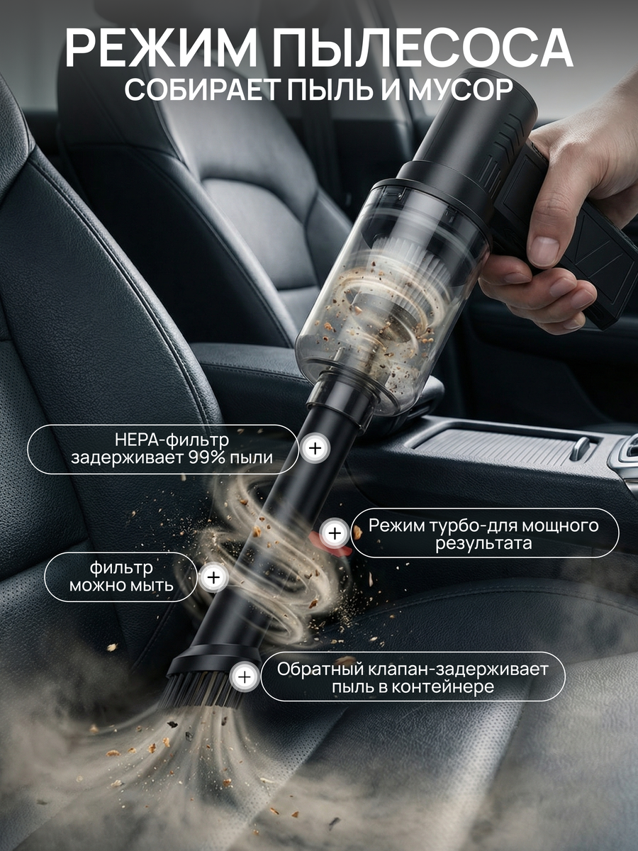 Воздуходувка выдувает крошки из-под сидений, из щелей между креслами, из подстаканников. Песок с ковриков — просто открываешь дверь и дуешь. Всё вылетает наружу. Потом можно пройтись влажной салфеткой — и салон как новый.