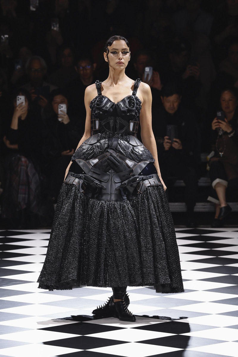 В рамках Недели моды в Париже прошел показ японского бренда Junya Watanabe. Одной из главных звезд мероприятия стала 40-летняя Ирина Шейк. Российская модель открыла шоу в скульптурном корсетном платье черного цвета. Оно было полностью сконструировано из множества переплетенных черных кожаных перчаток и ремней с пряжками. Этот наряд воплотил идею дизайнера о переработке привычных аксессуаров в сложные архитектурные формы. Затем Ирина появилась на подиуме в сюрреалистичном «мягком» наряде. Ансамбль напоминал нагромождение мягких игрушек, создающих объемный, почти гротескный силуэт. Образ дополнял драматичный макияж с эффектом «стекающих слез». Коллекция Джуньи Ватанабе в этом сезоне была посвящена теме осознанного потребления. Дизайнер использовал для создания подиумных вещей необычные материалы: в коллекции встречались элементы из старых кожаных сапог, металлических пластин и даже чехлов для телефонов.