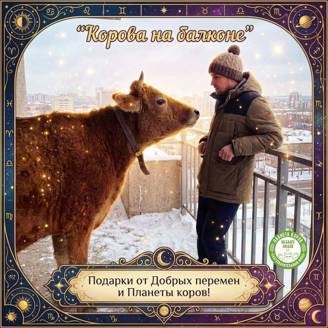 А это она спасла меня» 💚 Три года назад Игорь просто листал ленту и наткнулся на пост «Планеты Коров». Увидел кнопку «Стать опекуном» Он оформил опеку над коровой Расини. Просто потому что мог. 📊 Работа, дом, кнопки в телефоне — всё серое, безвкусное. Проснулся, отжил день, лёг. Зачем — непонятно. 🐄 А через месяц поймал себя на мысли, что проверяет телефон не по работе, а в ожидании фото от фонда. А через полгода впервые за 5 лет купил яблоки. Думал, что хорошо покормить Расини. А через год приехал знакомиться. Расини ткнулась влажным носом ему в ладонь, и у Алексея внутри что-то щёлкнуло. — Знаете, — сказал он нам тогда, — я всю жизнь искал, зачем просыпаться по утрам. А оказалось, достаточно, чтобы кто-то ждал. 📱 Теперь у Алексея в телефоне папка « Фото Расини» занимает больше места, чем рабочие документы. Он знает, что она любит морковку, а не яблоки. Что ей хорошо и что она его помнит. 🐮 Корова на балконе - это не про балкон, это про сердце. Эта связь на расстоянии. Ст