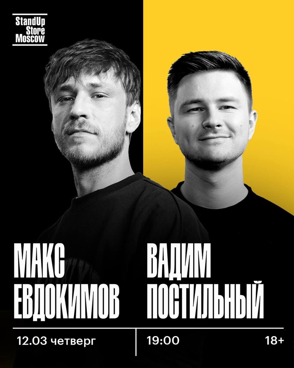 В 19:00 совместный концерт Макса Евдокимова и Вадима Постильного Купить билет В 21:30 стендап Дагестан Купить билет 📍 Наш адрес: ул.Петровка, д.21с1, StandUp Store Moscow