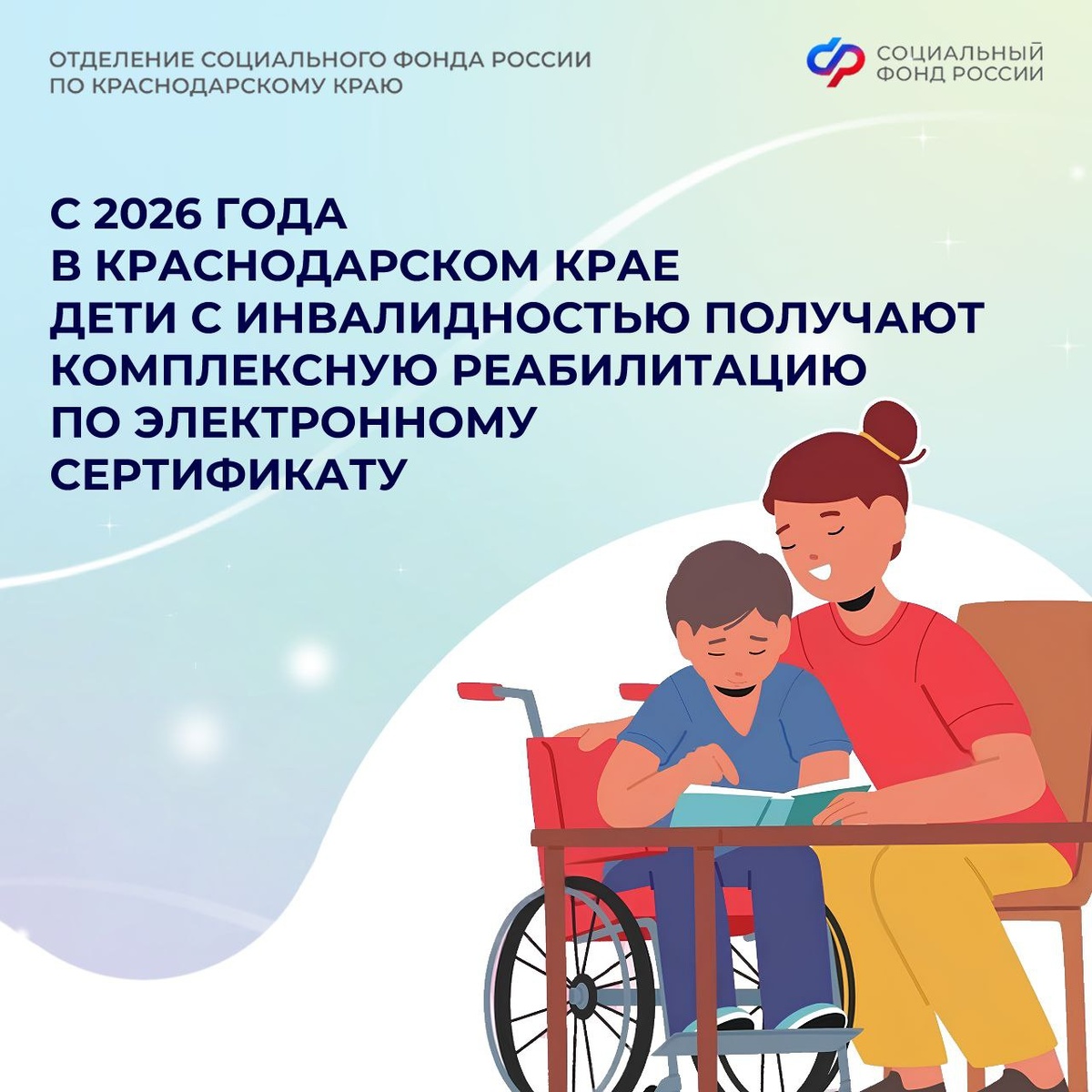 комплексную реабилитацию по электронному сертификату! 💙 📌 Что дает сертификат? ✔️ 21-дневный курс реабилитации + оплата проживания, питания ребенка и сопровождающего. ✔️ Сумма до 115,4 тысяч рублей в 2026 году. ✔️ Автоматическое оформление — без лишних обращений! 👶 Кто может участвовать? Дети от 4 до 17 лет, которым впервые установлена категория «ребенок-инвалид» с 2026 года. 📆 Срок действия сертификата — 12 месяцев с момента установления инвалидности. 🚂 Родители могут подать заявление на бесплатный проезд поездом или компенсацию на личном авто к месту реабилитации и обратно. 💡 Цель проекта — улучшить качество жизни семей с детьми с инвалидностью и обеспечить доступ к современным реабилитационным услугам. ☎️🏠 Если остались вопросы, то всегда можно обратиться в единый контакт-центр СФР 8(800)100-00-01 или лично в клиентскую службу Отделения СФР по Краснодарскому краю. 📲👉 Подписывайтесь на наш канал в MAХ и будьте в курсе всех мер соцподдержки 🔥 #СФР #реабилитация #дети