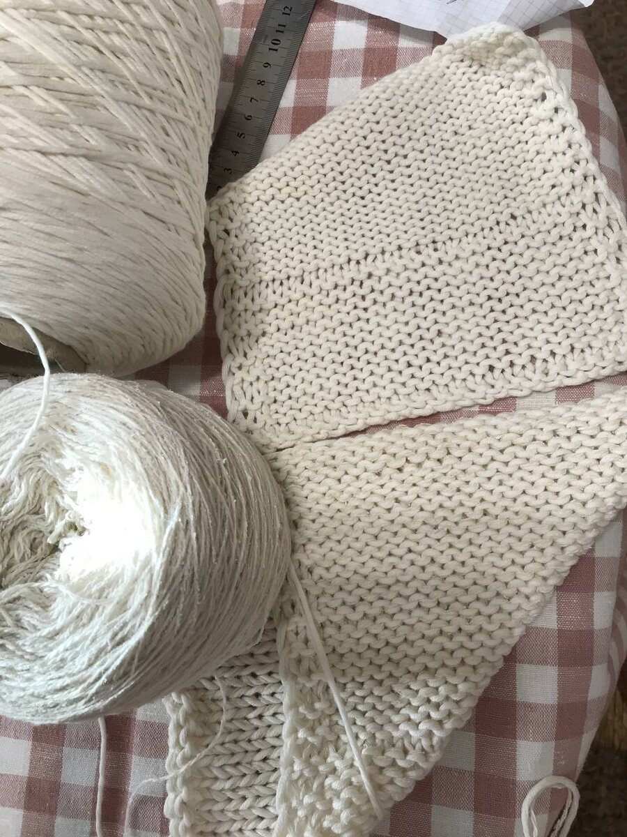 ! Многострадальный проект Огромное количество образцов 2 начала спинки Очень хотелось в белом цвете Но связалось в таком И эта пряжа , которая не прощает никаких ошибок Специально вязала туго И разные спицы взяла - одна обычная , другая кубическая Но рядность просто во всей красе И это только отпарено Еще не стирала Хочется структуры - но добиться этого от трикотажного полотна - здесь проблематично Еще пока сшиваю И нужно обработать низ рукавов и придумать какие планки для всего изделия