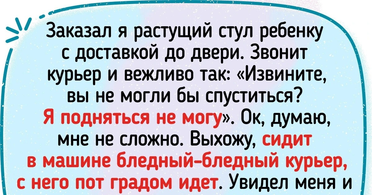 Заказал я растущий стул ребенку с доставкой до двери. Звонит курьер и вежливо так: «Извините, вы не могли бы спуститься? Я подняться не могу. Я внизу все объясню». Ок, думаю, мне не сложно. Выхожу, сидит в машине бледный-бледный курьер, с него пот градом идет. Увидел меня и, вылезая бочком из машины, говорит: «Извините, пожалуйста, но я очень сильно захотел в туалет. Если бы я пошел со стулом на четвертый этаж, я бы не дошел». Запнулся, поблагодарил и рванул быстрее к белому другу. © Unknown author / Pikabu