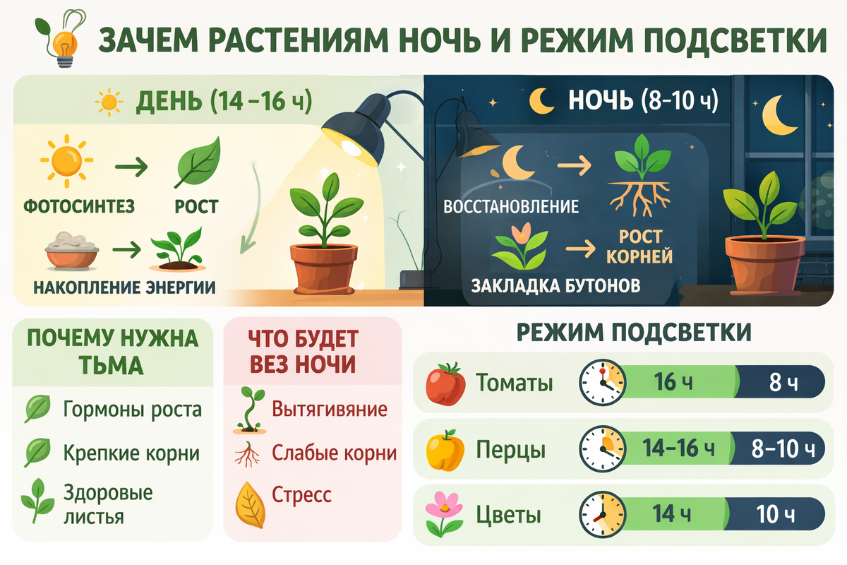 Зачем растениям нужна ночь? И на ночь обязательно лампы отключаем! Темнота — это не «перерыв», а обязательная часть роста, гормонов и восстановления. 🌿 Зачем растениям ночь 1️⃣ Переключение процессов Днём — фотосинтез (делают сахар из света). Ночью — расходуют его на рост корней, листьев, цветков. 👉 Без темноты рост хуже. 2️⃣ Гормоны и биоритмы В темноте вырабатываются гормоны роста (в т.ч. ауксины). Формируются бутоны у многих культур (фотопериодизм). 3️⃣ Восстановление тканей Ночью растения «ремонтируют» клетки и снимают стресс. 4️⃣ Экономия энергии Постоянный свет истощает: листья мельчают, бледнеют, куст вытягивается. 💡 Нужно ли выключать лампы на ночь Да, обязательно. Оптимально большинству растений: 🕒 14–16 часов света 🌑 8–10 часов полной темноты 👉 Даже рассада (томаты, перец, цветы) лучше растёт с ночным «отдыхом». ❗ Что будет, если не выключать - задержка цветения - вытягивание рассады - слабые корни - стресс и хлороз
