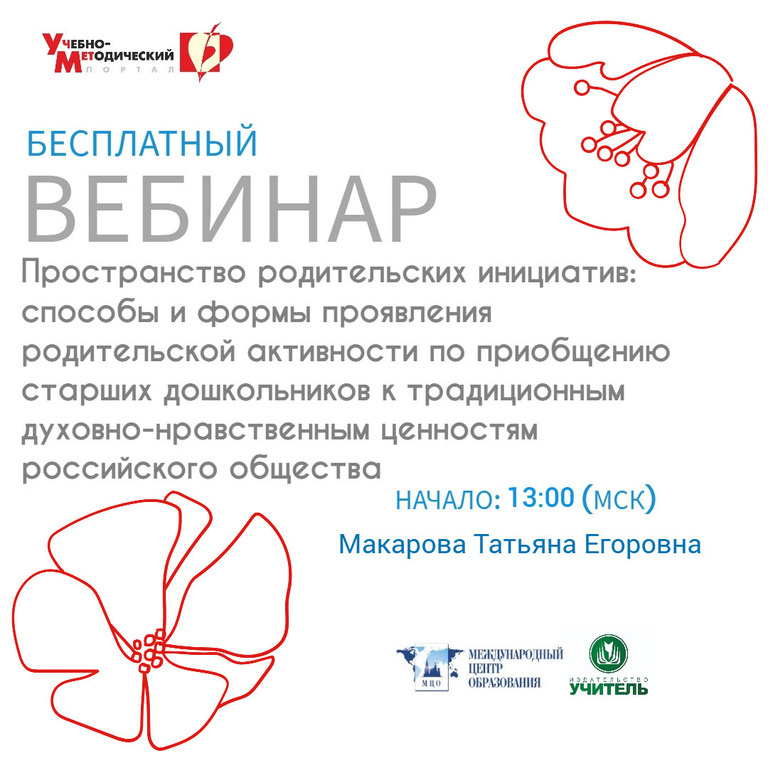 дошкольников к традиционным духовно-нравственным ценностям российского общества» Дата проведения: 11.03.2026 Начало: 13:00 (МСК) https://www.uchmet.ru/events/item/4078688/ На вебинаре слушатели вместе с ведущим познакомятся с современными способами и формами проявления родительской активности по приобщению старших дошкольников к традиционным духовно-нравственным ценностям российского общества. На вебинаре будут рассмотрены следующие ВОПРОСЫ: - Актуальность создания и реализации пространства родительских инициатив в ДОО. - Особенности понятия «пространство родительских инициатив», способы и формы проявления родительской активности в ДОО, характеристика традиционных духовно-нравственных ценностей российского общества с учетом ФОП ДО и других государственных документов. - Роль семьи и родительских инициатив в приобщении старших дошкольников к традиционным духовно-нравственным ценностям российского общества. - Материалы из опыта взаимодействия ДОО и семьи в СП «Детский сад «Березка» ГБОУ