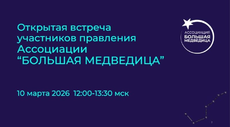 10 марта 2026 с 12.00 до 13.30 по Мск Уважаемые друзья и коллеги! Приглашаем присоединиться к открытому эфиру Общего собрания и Правления Ассоциации профессиональных участников венчурного и инвестиционного рынка "БОЛЬШАЯ МЕДВЕДИЦА"! Вопросы для обсуждения сегодня: 🔸 Стратегия и ключевые направления работы Ассоциации на 2026 г. 🔸 Обновлённый состав и структура Правления и зоны ответственности 🔸 Презентация ключевых продуктов и сервисов Ассоциации в 2026 г. 🔸 Календарь российский и международных событий во 2 кв. 2026 г. 🔸 Вопросы и дискуссия Ассоциация "БОЛЬШАЯ МЕДВЕДИЦА" создана в 2024 г. Это отраслевое объединение профессиональных участников инвестиционного рынка: корпоративные и частные фонды и семейные офисы, инвестиционные и бизнес-клубы, брокеры и консультанты, технопарки и стартап студии, институты развития и инвестиционные площадки. Ссылка для подключения к эфиру: Тема: Открытая встреча. Общее собрание и Правление Ассоциации БОЛЬШАЯ МЕДВЕДИЦА Время: 10 мар. 2026 12:0
