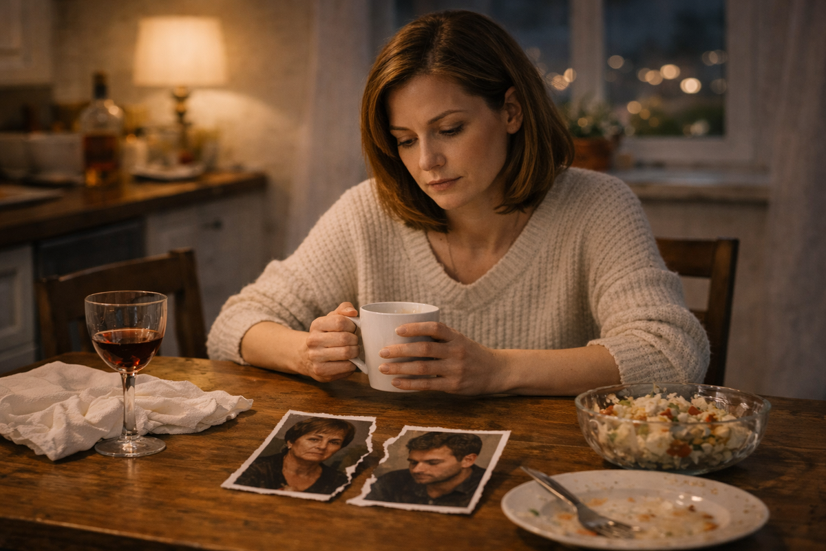 На столе стояли недопитые бокалы, тарелки с обрезками хлеба, смятые салфетки, серые от усталости розы в вазе. Праздник кончился так, как кончаются многие семейные вечера: не тортом, а правдой, которую слишком долго прятали под скатерть.